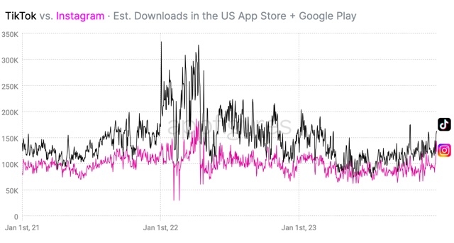 다른 회사인 AppFigures의 데이터도 이러한 결론을 뒷받침하지만 TikTok의 수익은 증가하고 있지만 다운로드는 정체되거나 성장보다 더 많이 감소하고 있다고 덧붙였습니다. 이러한 추세는 전 세계적으로나 세계적으로나 1년 넘게 계속되고 있습니다. 미국.
